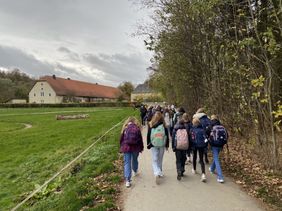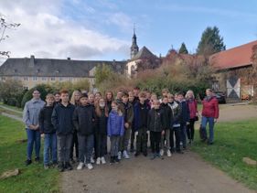 Im Rahmen der Unterrichtsreihe „Orden und Klöster“, mit der sich die Schüler:innen in den letzten Wochen fächerübergreifend in Geschichte und Religion beschäftigt haben, machten sich alle Siebtklässler:innen zusammen mit der Stadtführerin Frau Ising und ihren Lehrkräften auf den Weg zum Gut Holthausen, einer ehemaligen Klosteranlage der Zisterzienserinnen im Stadtgebiet Büren. Dabei konnten die Jugendlichen das Flair der alten Klosteranlage hautnah erleben, indem sie, neben einer ausführlichen Führung durch die Kapelle des ehemaligen Klosters, auch die Orgelbühne und den Kapitelsaal kennenlernen durften. Auf dem Fußweg hin und zurück zum Gut Holthausen bekamen sie zudem vielen Eindrücke und Informationen darüber, wo sich die Spuren des Wirkens der Ordensleute auch heute noch in der Bürener Lebenswelt der Schüler:innen wiederfinden lassen.