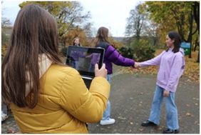 Anschließend fanden wir uns in unseren Gruppen zusammen, um unsere Drehbücher zu überarbeiten. Es wurden Musikvideos, Dokumentationen, Werbespots, Episoden von Serien und eine Quizshow gedreht. Dabei wurden wir natürlich von Herrn Günther unterstützt. Seine Kollegin Frau Grams begleitete und fotografierte uns.