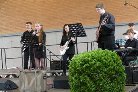 Die Feierlichkeiten wurden anschließend in der festlich geschmückten Turnhalle fortgeführt. Das Motto des Gottesdienstes wurde auch hier aufgegriffen, sodass die Abiturientia zusammen mit Stufenleiter Ulrich Mersch-Justus, Oberstufenkoordinator Christian Wiese und Schulleiter Thorsten Harnischmacher ein umfangreiches Programm auf die Beine stellte. Durch musikalische Beiträge der Rockband, der Abiturientinnen Mia Geesmeier und Charlotte Werny sowie durch das Ständchen des Jahrgangs Q1 wurde die Entlassfeier künstlerisch umrahmt.