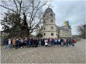 Am 06. April 2022 unternahmen alle Klassen der Jahrgangsstufe 9 im Rahmen der Kooperation des LFG mit der Wewelsburg gemeinsam eine Exkursion zur Gedenkstätte. Begleitet wurden sie von den Geschichtslehrerinnen Frau Funke, Frau Wendeler und Frau Diermann. Vor Ort erhielten die Schülerinnen und Schüler, unterstützt durch Museumspädagoginnen, interessante Einblicke in die Dauerausstellung „Ideologie und Terror der SS“. Besonders eindrucksvoll war es, die Inhalte und Themen aus dem Geschichtsunterricht mit Ereignissen in der Nähe des eigenen Wohnortes zu verknüpfen und zu erkennen, dass die Geschichte des Nationalsozialismus in Deutschland nicht nur irgendwo, sondern auch ganz lokal, in der Nähe unserer Schule, Auswirkungen hat. Außerdem gingen alle Klassen zum im Dorf gelegenen Mahnmal für die Opfer des KZ Niederhagen, das an alle Menschen erinnern soll, die ihr Leben in dem im Ort gelegenen Konzentrationslager verloren haben und künftige Generationen dazu aufrufen soll, sich für die Demokratie einzusetzen.