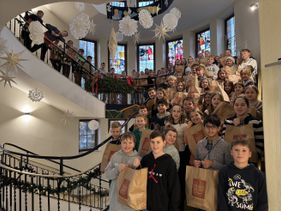 Am Nikolaustag machten sich dann die 5. Klassen auf den Weg zur Bürener Speisekammer, wo die gut gefüllten Tüten an Frau Bischof, die ehrenamtliche Leiterin der Speisekammer Büren, übergeben werden konnten. Bei dem Besuch erklärte Frau Bischof den Schülerinnen und Schülern auch, wie viele bedürftige Menschen auf die Lebensmittelspenden und die Bürener Speisekammer angewiesen sind, wie die Verteilung funktioniert und wie viel Gutes mit den Spendentüten bewirkt werden kann. Wegen des strömenden Regens konnten die 6. Klassen eine Stunde später ihre Tüten leider nicht mehr selbst zur Speisekammer bringen, so dass diese mit zwei randvoll gepackten Autos dorthin gefahren wurden.