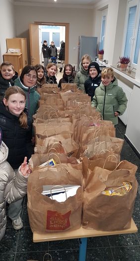Über 150 Spendentüten wurden mit haltbaren Lebensmitteln, Pflegeprodukten, weihnachtlichem Gebäck und vielem mehr gefüllt, Weihnachtsgrüße wurden dazu geschrieben oder gemalt.