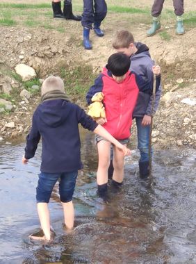 Neugierig auf den neuen Lebensraum, aber auch auf die Baumaschinen und die flitzenden Trecker erkundeten die Naturforscher des Jahrgangs 5 unter fachkundiger Führung des WOL (Wasserverbands Obere Lippe) das neue Renaturierungsgebiet. Nach einer kurzen Einführung durch Herrn Schäfers und Herrn Schnell, in der Herr Schäfers als verantwortlicher Planer des WOL die Idee hinter den Baggerarbeiten erklärten, ging es direkt an die neue Alme. In Gummistiefeln oder Wanderschuhen wurden die Uferbereiche erobert, neugierige Fragen gestellt und sich am und im Wasser ausgetobt.