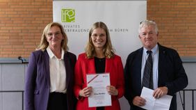 Aus den Händen von Schulleiter Thorsten Harnischmacher erhielten sie heute ihre Abiturzeugnisse. Drei Schüler:innen und wurden zudem besonders ausgezeichnet: Elias Schäfer bekam den Wöhler-Mint-Award für herausragende Leistungen im Bereich Naturwissenschaften von Thorsten Schumacher, Firma Wöhler. Patrick Pelkmann von der Volksbank OWL übergab Kim Müller den Volksbank Social Award und den Malteser Schulpreis für herausragendes schulisches Engagement erhielt Wilma Henneken. Er wurde überreicht von Andrea Kersting, Malteser Werke gGmbH, und Carl Freiherr von Lüninck, Kuratorium der Malteser Werke.