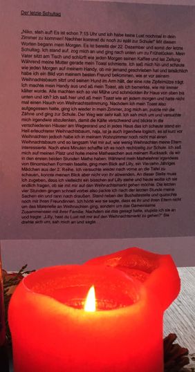 Eine der vielen gelungenen Kurzgeschichten wollen wir - die Klasse 8a und Frau Gibert - euch nicht vorenthalten und wünschen allen Menschen des LFGs besinnliche Weihnachtsfeiertage und ein Frohes Fest!